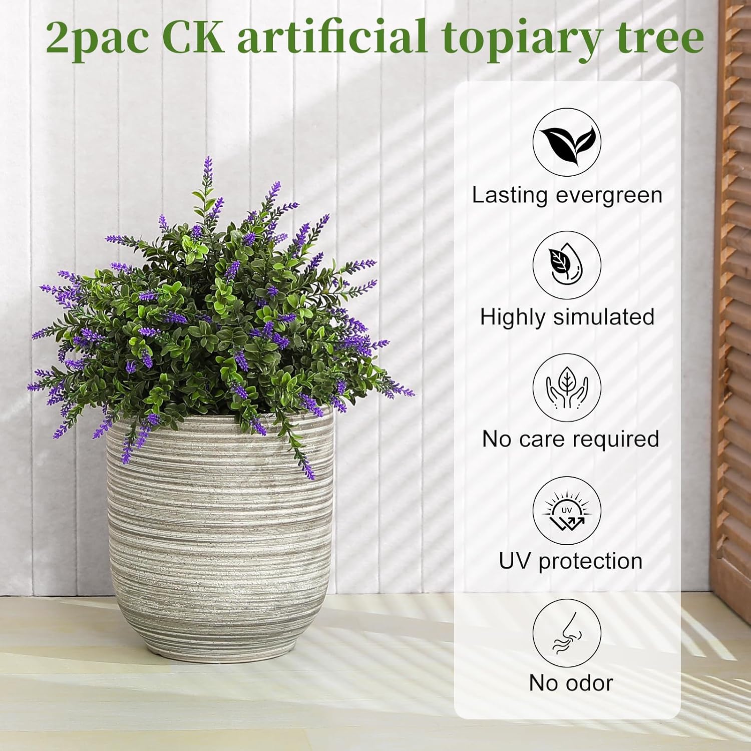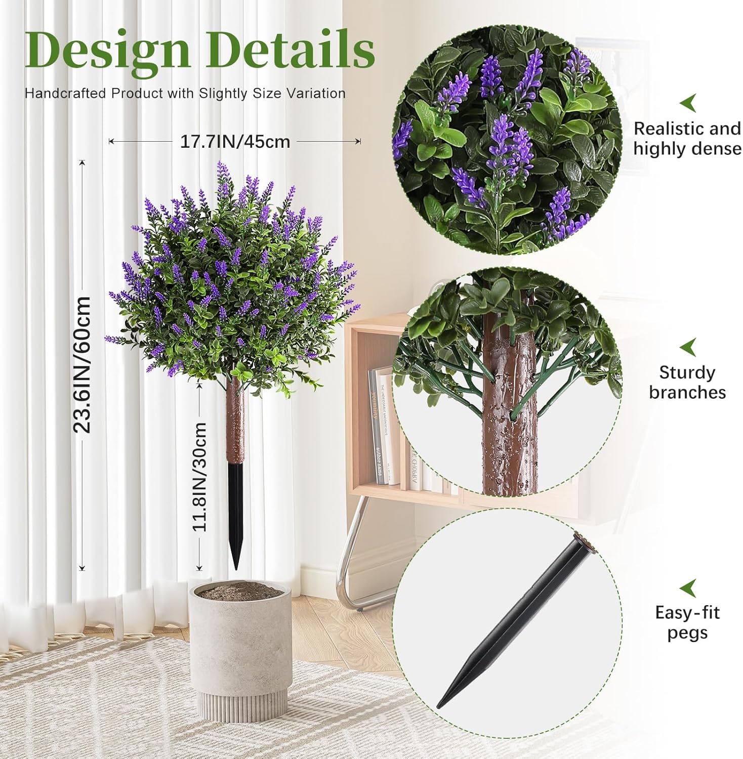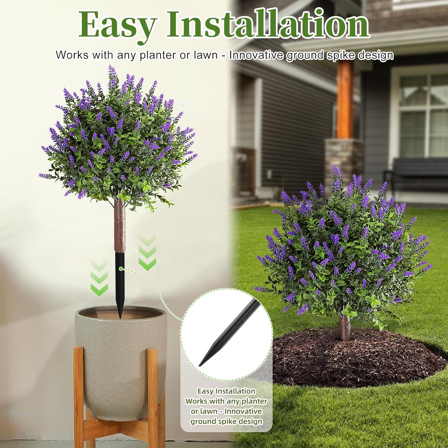 2 Pack Artificial Lavender with Boxwood Topiary Ball,23.6″ UV Resistant Artificial Shrubs,with Ground Spikes, Indoor and Outdoor Fake Evergreen Tree for Porch, Garden, Front Door Decoration