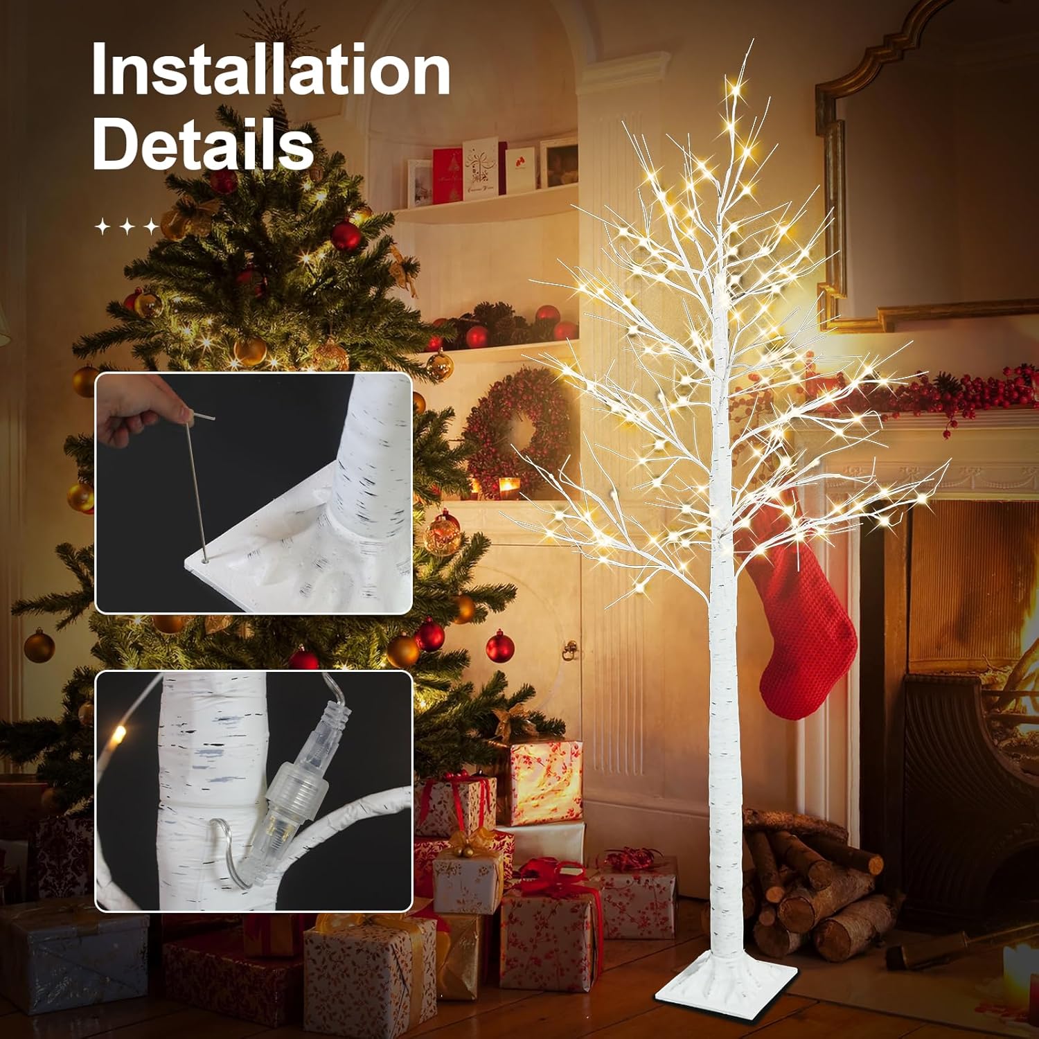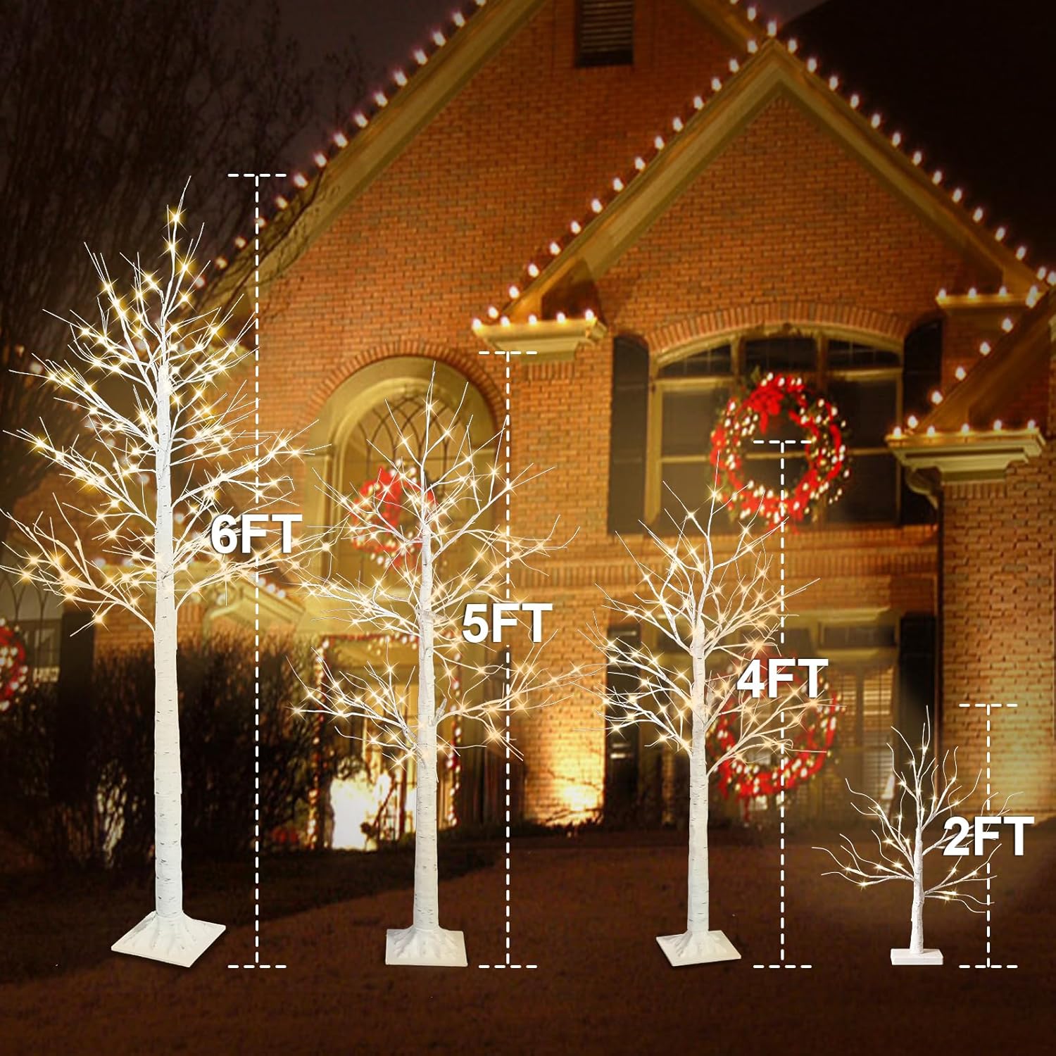 This set of 4 birch trees in heights of 2FT, 4FT, 5FT, and 6FT. Each tree is adorned with 24, 64, 90, and 120 warm white LED lights.